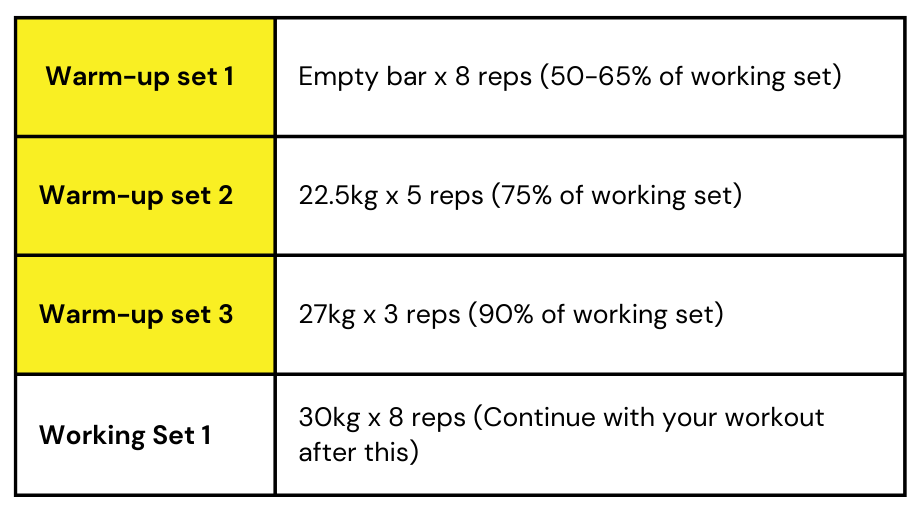 In this example, the working weight is 30kg and an empty bar usually weighs around 15-20kg. As a result, the first warm-up set is already at 50-65% making the next warm-up set higher at 75%.